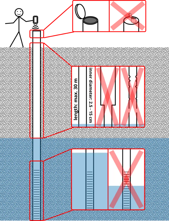 Groundwater levels must be at a maximum of 30 meters below the open top of the pipe.